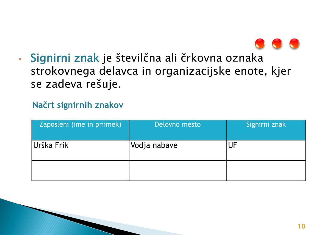 Načrt signirnih znakov • Signirni znakje številčna ali črkovna oznaka strokovnega delavca in organizacijske enote, kjer se zadeva rešuje.