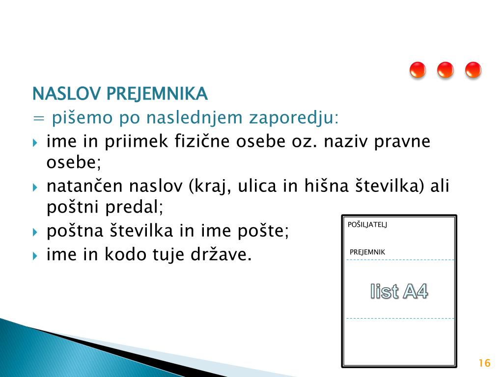Pravilno naslavljanje Uporabimo lahko berljivo pisavo, velikosti od 10 do 12; naslov je napisan v desnem spodnjem delu in je levo poravnan; znotraj naslova ni praznih vrstic; pod naslovom ni nobenih dodatnih podatkov (telefonskih številk, številk transakcijskih računov …); poštna številka in naziv naslovne pošte sta zmeraj v isti vrstici; pri pošiljkah za tujino navedemo pred poštno številko tudi kodo države, npr. CH – 3000 BERN, ŠVICA.