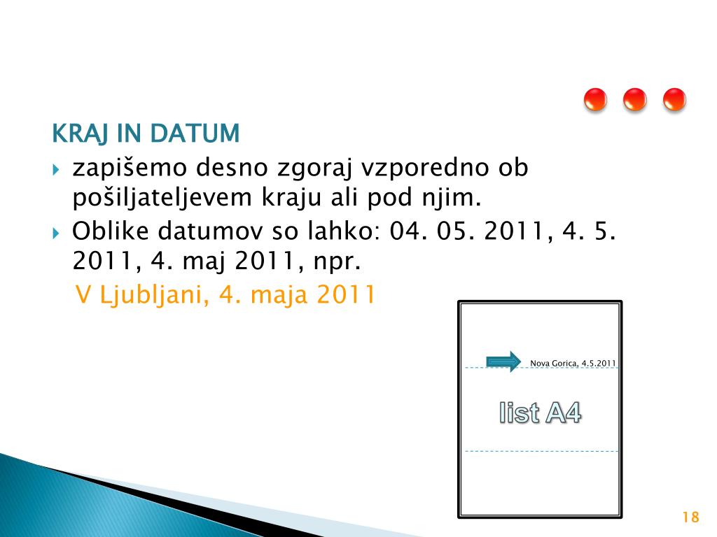 Nova Gorica, 4.5.2011 list A4 KRAJ IN DATUM zapišemo desno zgoraj vzporedno ob pošiljateljevem kraju ali pod njim. Oblike datumov so lahko: 04. 05. 2011, 4. 5. 2011, 4. maj 2011, npr. V Ljubljani, 4. maja 2011