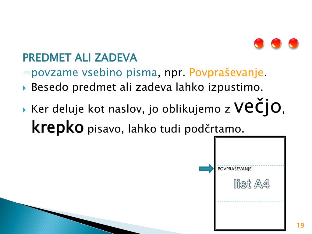 POVPRAŠEVANJE list A4 PREDMET ALI ZADEVA =povzame vsebino pisma, npr. Povpraševanje. Besedo predmet ali zadeva lahko izpustimo. Ker deluje kot naslov, jo oblikujemo z večjo, krepko pisavo, lahko tudi podčrtamo.
