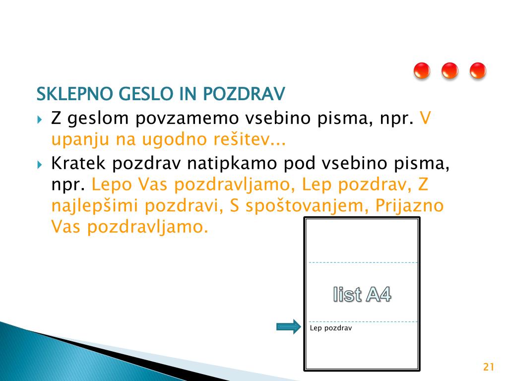 list A4 Lep pozdrav SKLEPNO GESLO IN POZDRAV Z geslom povzamemo vsebino pisma, npr.V upanju na ugodno rešitev... Kratek pozdrav natipkamo pod vsebino pisma, npr. Lepo Vas pozdravljamo, Lep pozdrav, Z najlepšimi pozdravi, S spoštovanjem, Prijazno Vas pozdravljamo.