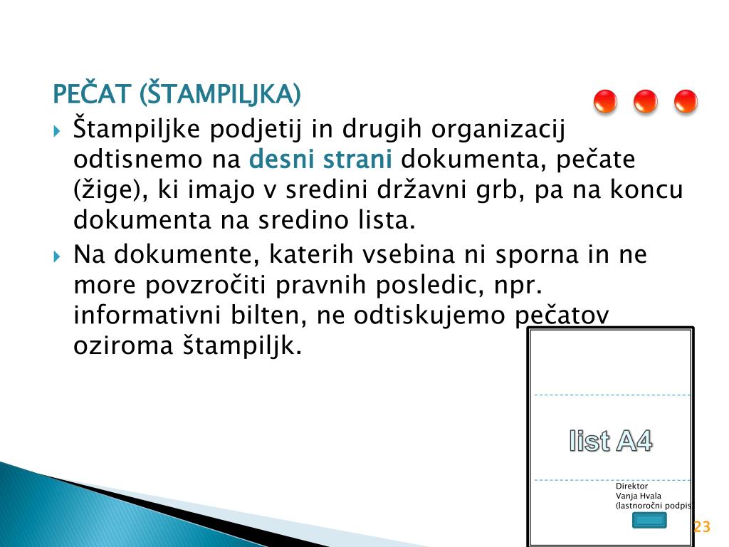 list A4 Direktor Vanja Hvala (lastnoročni podpis) PEČAT (ŠTAMPILJKA) Štampiljke podjetij in drugih organizacij odtisnemo na desni strani dokumenta, pečate (žige), ki imajo v sredini državni grb, pa na koncu dokumenta na sredino lista. Na dokumente, katerih vsebina ni sporna in ne more povzročiti pravnih posledic, npr. informativni bilten, ne odtiskujemo pečatov oziroma štampiljk.