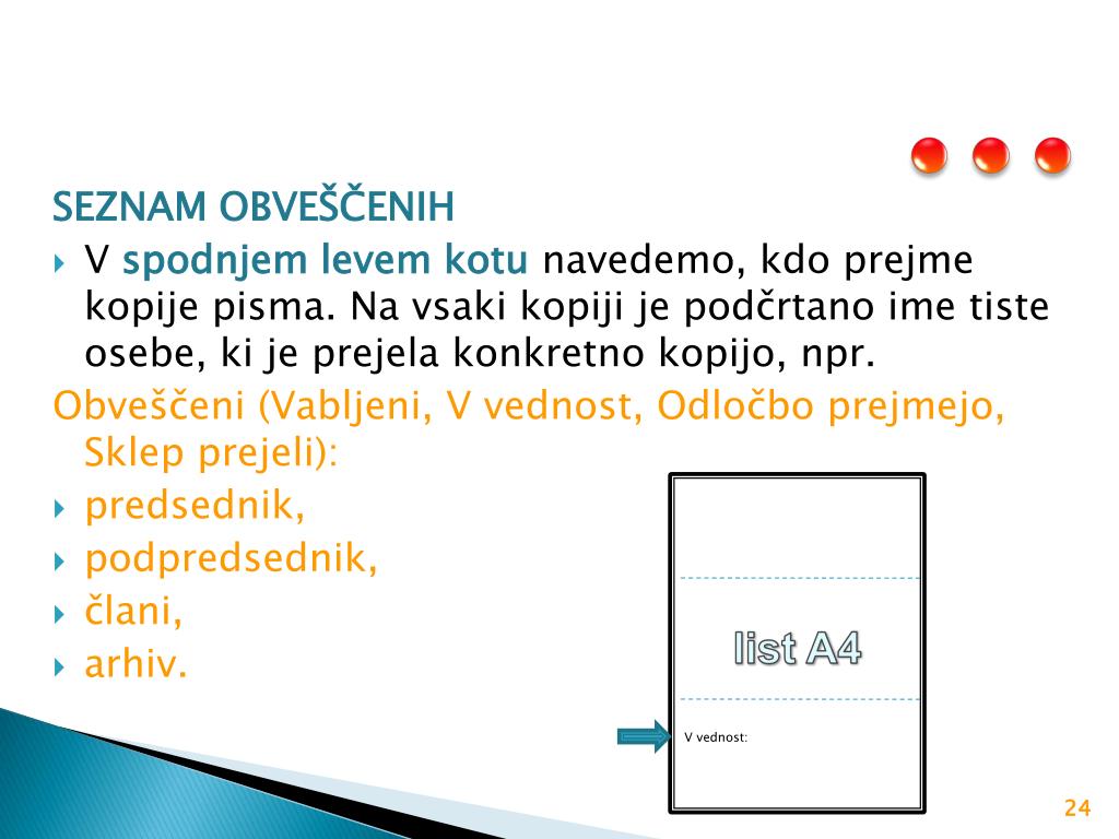 list A4 V vednost: SEZNAM OBVEŠČENIH V spodnjem levem kotu navedemo, kdo prejme kopije pisma. Na vsaki kopiji je podčrtano ime tiste osebe, ki je prejela konkretno kopijo, npr. Obveščeni (Vabljeni, V vednost, Odločbo prejmejo, Sklep prejeli): predsednik, podpredsednik, člani, arhiv.