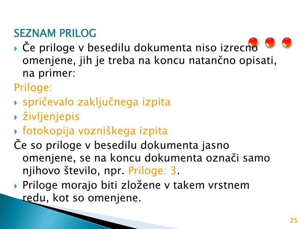 SEZNAM PRILOG Če priloge v besedilu dokumenta niso izrecno omenjene, jih je treba na koncu natančno opisati, na primer: Priloge: spričevalo zaključnega izpita življenjepis fotokopija vozniškega izpita Če so priloge v besedilu dokumenta jasno omenjene, se na koncu dokumenta označi samo njihovo število, npr. Priloge: 3. Priloge morajo biti zložene v takem vrstnem redu, kot so omenjene.