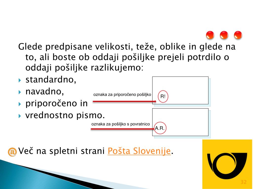 R! oznaka za priporočeno pošiljko A.R. oznaka za pošiljko s povratnico Glede predpisane velikosti, teže, oblike in glede na to, ali boste ob oddaji pošiljke prejeli potrdilo o oddaji pošiljke razlikujemo: standardno, navadno, priporočeno in vrednostno pismo. Več na spletni strani Pošta Slovenije.