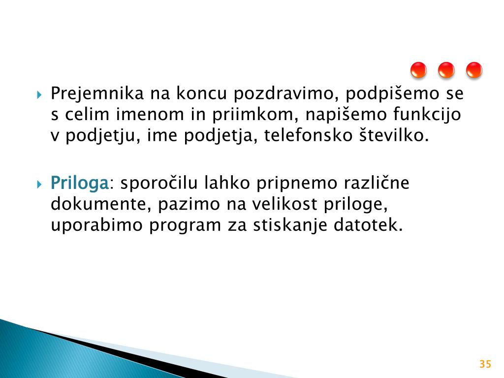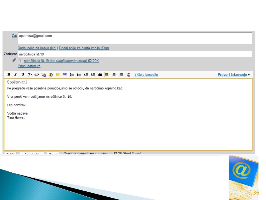 Prejemnika na koncu pozdravimo, podpišemo se s celim imenom in priimkom, napišemo funkcijo v podjetju, ime podjetja, telefonsko številko. • Priloga: sporočilu lahko pripnemo različne dokumente, pazimo na velikost priloge, uporabimo program za stiskanje datotek.