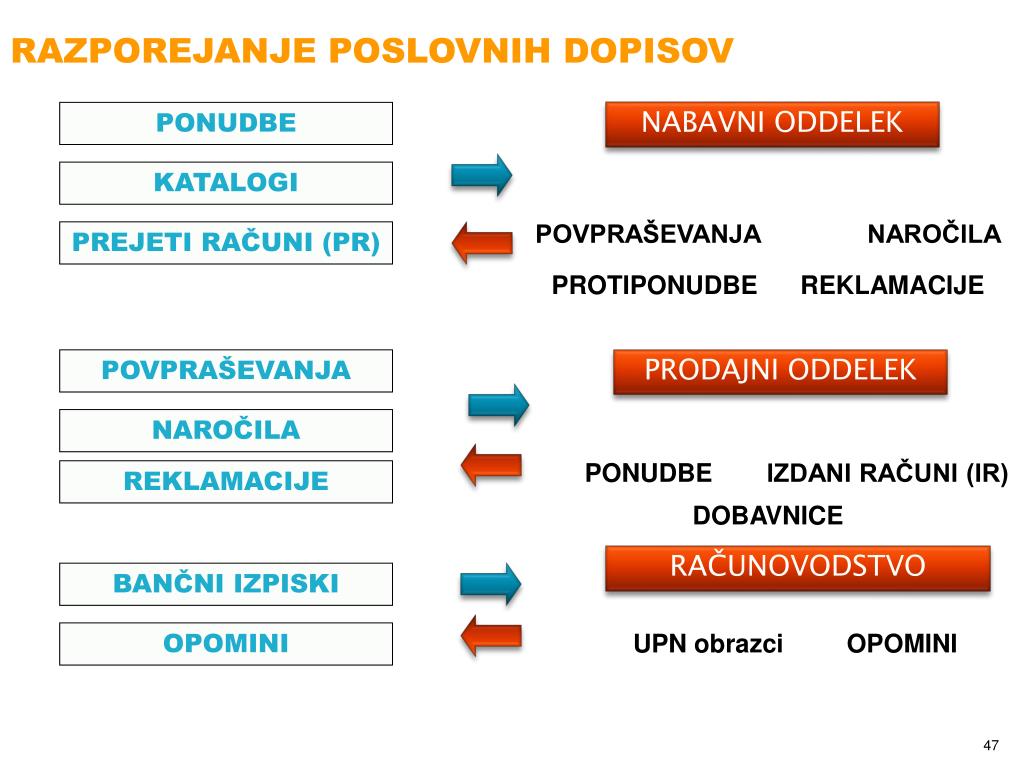 RAZPOREJANJE POSLOVNIH DOPISOV PONUDBE NABAVNI ODDELEK KATALOGI POVPRAŠEVANJA NAROČILA PREJETI RAČUNI (PR) PROTIPONUDBE REKLAMACIJE POVPRAŠEVANJA PRODAJNI ODDELEK NAROČILA PONUDBE IZDANI RAČUNI (IR) REKLAMACIJE DOBAVNICE RAČUNOVODSTVO BANČNI IZPISKI UPN obrazci OPOMINI OPOMINI