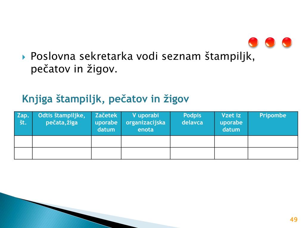 Poslovna sekretarka vodi seznam štampiljk, pečatov in žigov. Knjiga štampiljk, pečatov in žigov