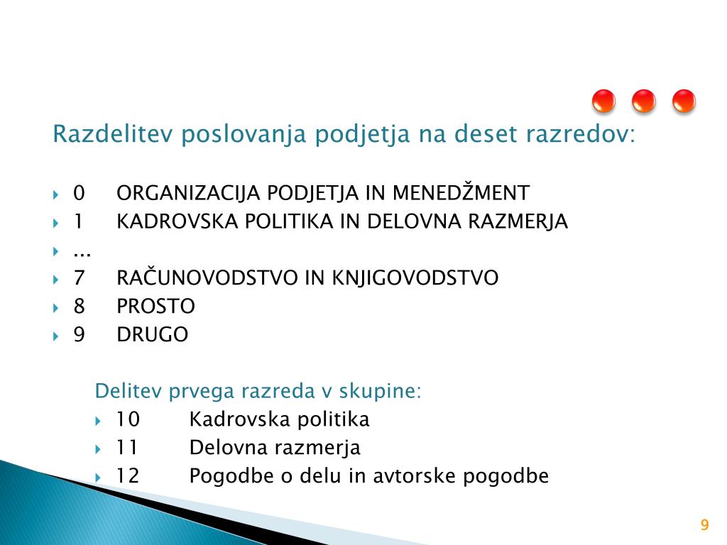 Razdelitev poslovanja podjetja na deset razredov: 0 ORGANIZACIJA PODJETJA IN MENEDŽMENT 1 KADROVSKA POLITIKA IN DELOVNA RAZMERJA ... 7 RAČUNOVODSTVO IN KNJIGOVODSTVO 8 PROSTO 9 DRUGO Delitev prvega razreda v skupine: 10 Kadrovska politika 11 Delovna razmerja 12 Pogodbe o delu in avtorske pogodbe