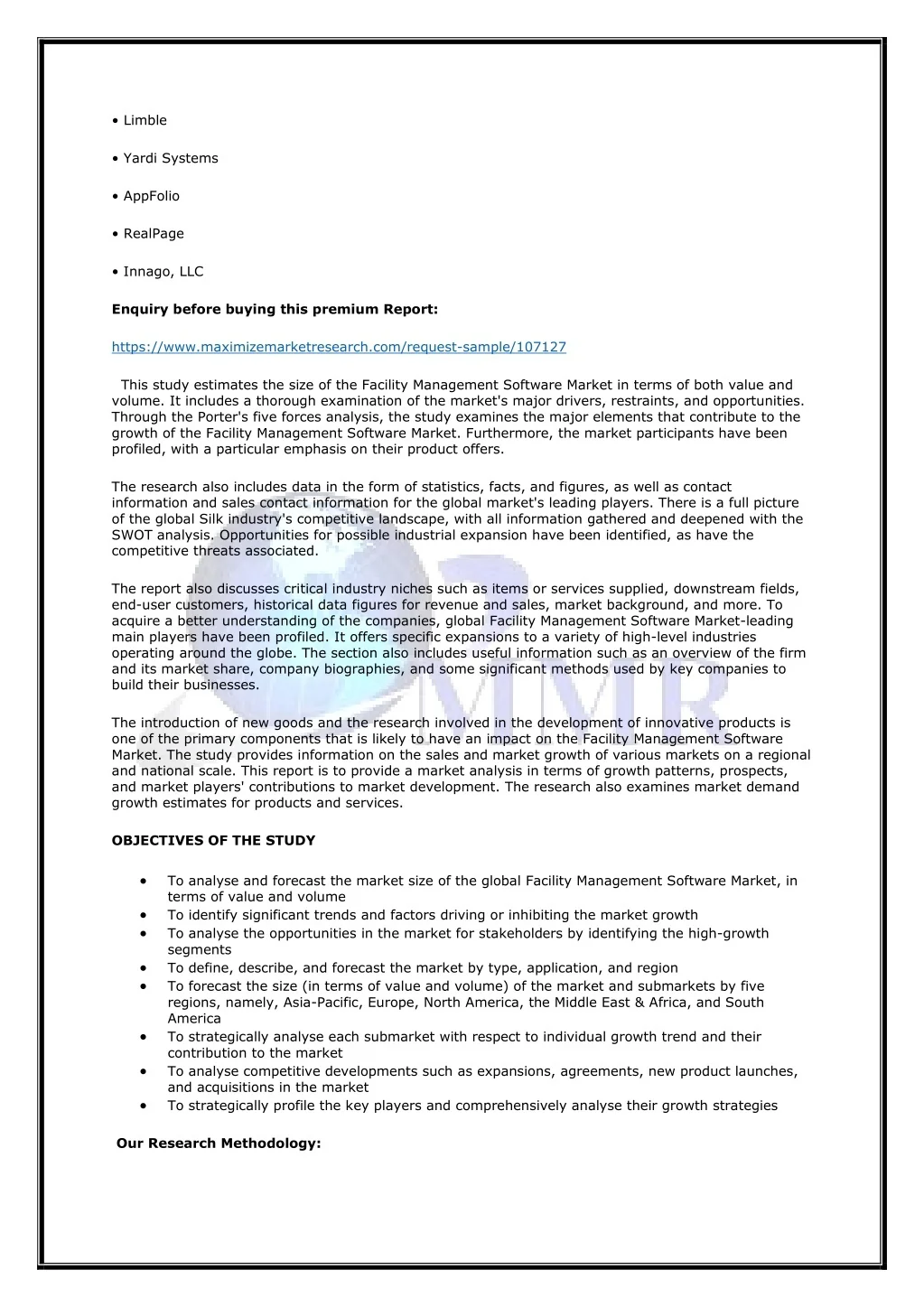 • Limble • Yardi Systems • AppFolio • RealPage • Innago, LLC Enquiry before buying this premium Report: https://www.maximizemarketresearch.com/request-sample/107127 This study estimates the size of the Facility Management Software Market in terms of both value and volume. It includes a thorough examination of the market's major drivers, restraints, and opportunities. Through the Porter's five forces analysis, the study examines the major elements that contribute to the growth of the Facility Management Software Market. Furthermore, the market participants have been profiled, with a particular emphasis on their product offers. The research also includes data in the form of statistics, facts, and figures, as well as contact information and sales contact information for the global market's leading players. There is a full picture of the global Silk industry's competitive landscape, with all information gathered and deepened with the SWOT analysis. Opportunities for possible industrial expansion have been identified, as have the competitive threats associated. The report also discusses critical industry niches such as items or services supplied, downstream fields, end-user customers, historical data figures for revenue and sales, market background, and more. To acquire a better understanding of the companies, global Facility Management Software Market-leading main players have been profiled. It offers specific expansions to a variety of high-level industries operating around the globe. The section also includes useful information such as an overview of the firm and its market share, company biographies, and some significant methods used by key companies to build their businesses. The introduction of new goods and the research involved in the development of innovative products is one of the primary components that is likely to have an impact on the Facility Management Software Market. The study provides information on the sales and market growth of various markets on a regional and national scale. This report is to provide a market analysis in terms of growth patterns, prospects, and market players' contributions to market development. The research also examines market demand growth estimates for products and services. OBJECTIVES OF THE STUDY To analyse and forecast the market size of the global Facility Management Software Market, in terms of value and volume To identify significant trends and factors driving or inhibiting the market growth To analyse the opportunities in the market for stakeholders by identifying the high-growth segments To define, describe, and forecast the market by type, application, and region To forecast the size (in terms of value and volume) of the market and submarkets by five regions, namely, Asia-Pacific, Europe, North America, the Middle East & Africa, and South America To strategically analyse each submarket with respect to individual growth trend and their contribution to the market To analyse competitive developments such as expansions, agreements, new product launches, and acquisitions in the market To strategically profile the key players and comprehensively analyse their growth strategies Our Research Methodology: