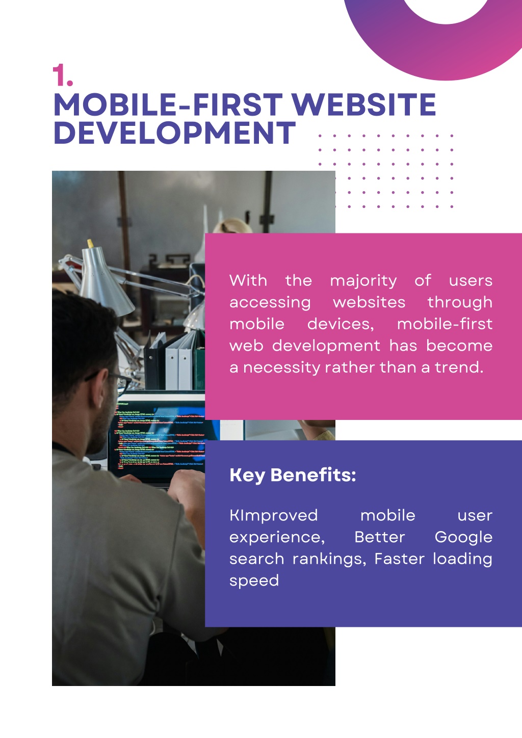 3. 1. MOBILE-FIRST WEBSITE DEVELOPMENT With the majority of users accessing websites mobile devices, web development has become a necessity rather than a trend. through mobile-first Key Benefits: KImproved experience, search rankings, Faster loading speed mobile Better user Google