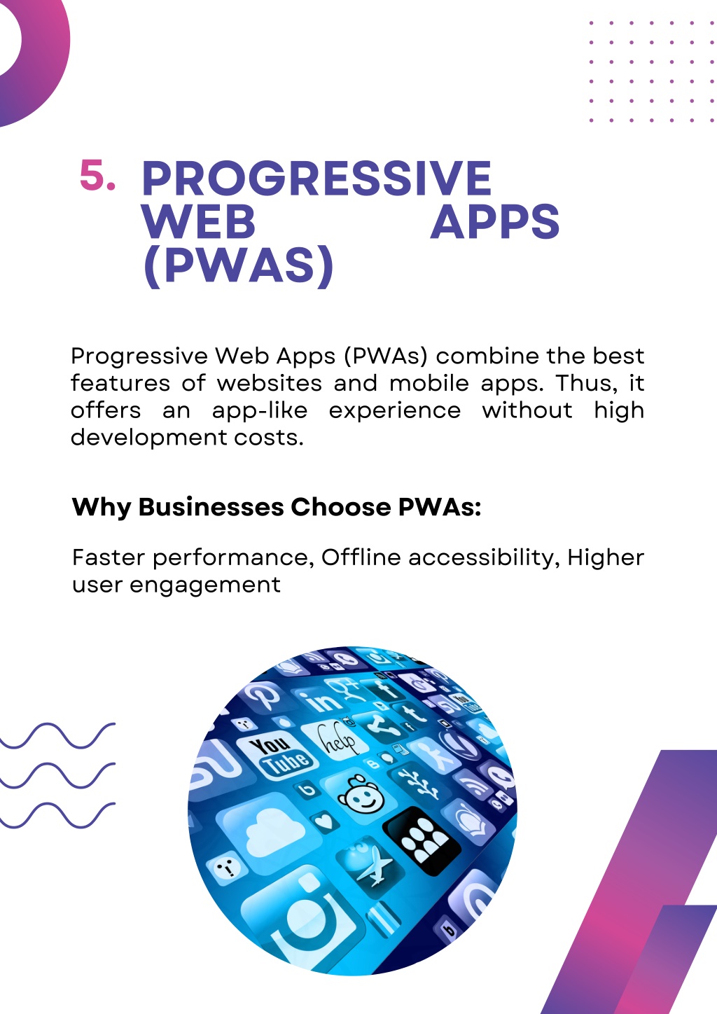 7. PROGRESSIVE WEB (PWAS) 5. APPS Progressive Web Apps (PWAs) combine the best features of websites and mobile apps. Thus, it offers an app-like experience without high development costs. Why Businesses Choose PWAs: Faster performance, Offline accessibility, Higher user engagement
