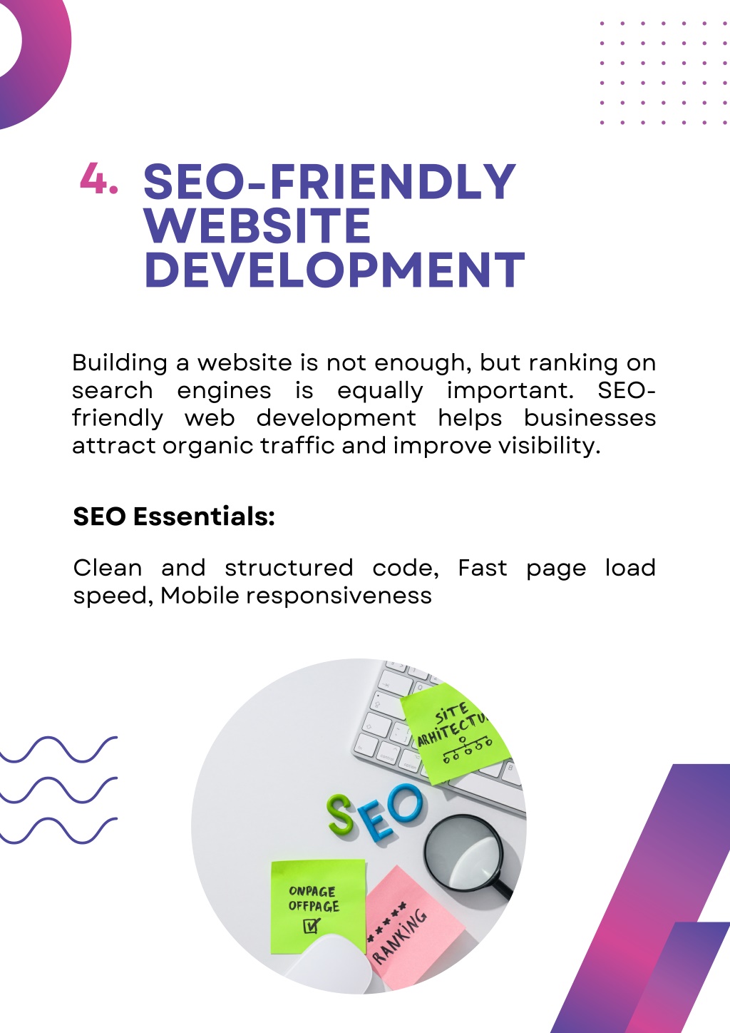 4. WEBSITE SPEED & PERFORMANCE OPTIMIZATION 2. Website engagement performance optimization ensures fast-loading, smooth, and reliable websites. speed directly conversions. impacts user and Website Best Practices: Image and code optimization, Lazy loading implementation, High-quality hosting solutions.