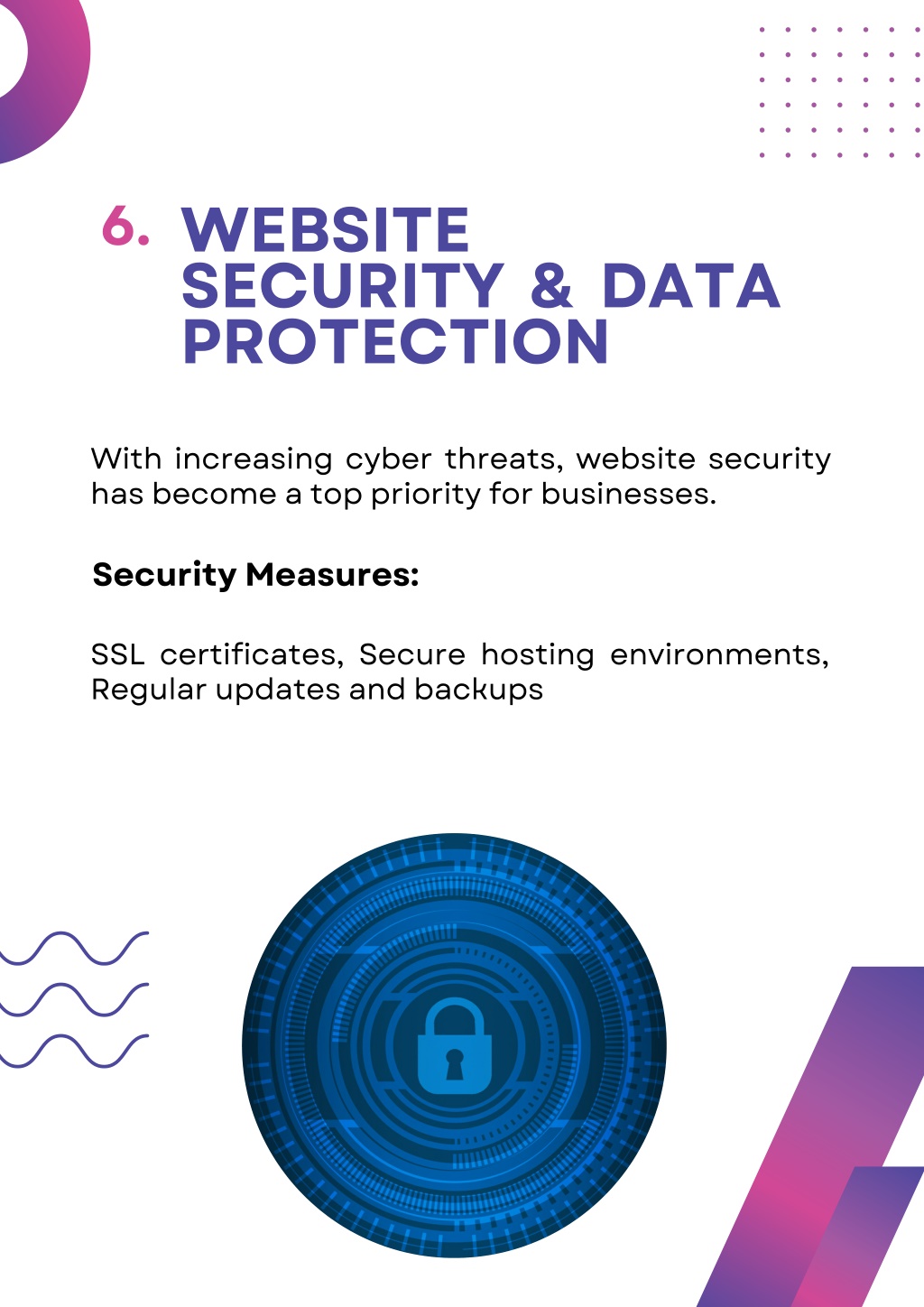 8. WEBSITE SECURITY & DATA PROTECTION 6. With increasing cyber threats, website security has become a top priority for businesses. Security Measures: SSL certificates, Secure hosting environments, Regular updates and backups