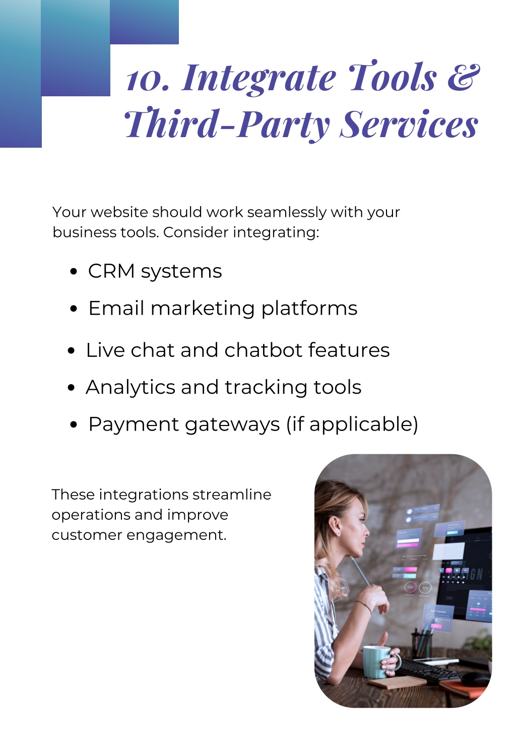 10. Integrate Tools & Third-Party Services Your website should work seamlessly with your business tools. Consider integrating: CRM systems Email marketing platforms Live chat and chatbot features Analytics and tracking tools Payment gateways (if applicable) These integrations streamline operations and improve customer engagement.