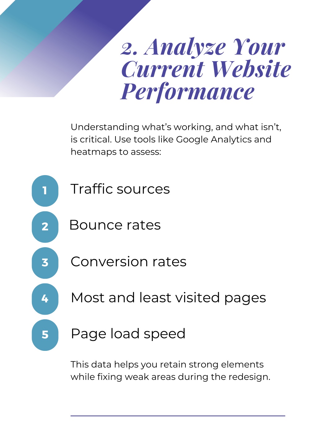 2. Analyze Your Current Website Performance Understanding what’s working, and what isn’t, is critical. Use tools like Google Analytics and heatmaps to assess: Traffic sources 1 Bounce rates 2 Conversion rates 3 Most and least visited pages 4 Page load speed 5 This data helps you retain strong elements while fixing weak areas during the redesign.