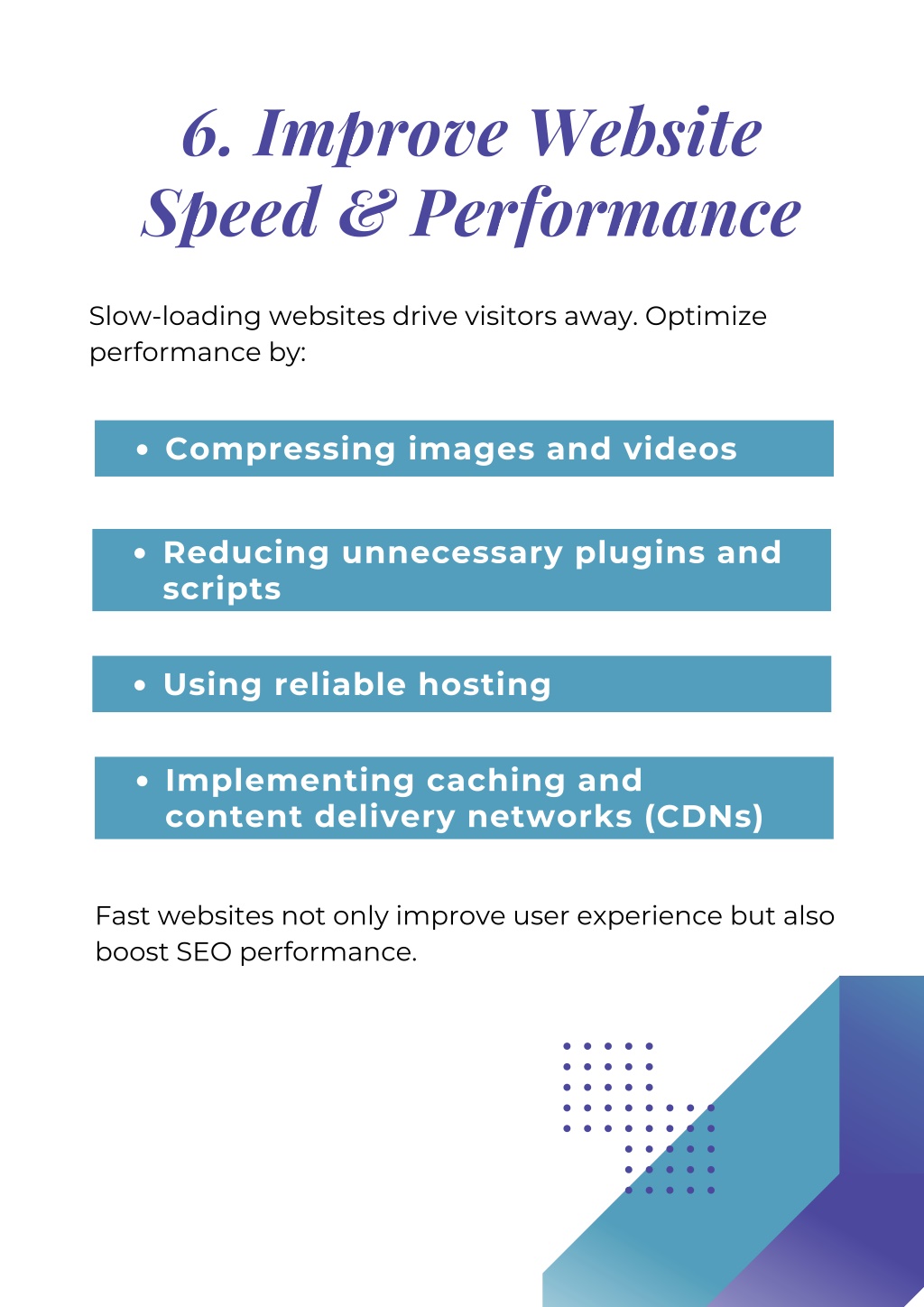 6. Improve Website Speed & Performance Slow-loading websites drive visitors away. Optimize performance by: Compressing images and videos Reducing unnecessary plugins and scripts Using reliable hosting Implementing caching and content delivery networks (CDNs) Fast websites not only improve user experience but also boost SEO performance.