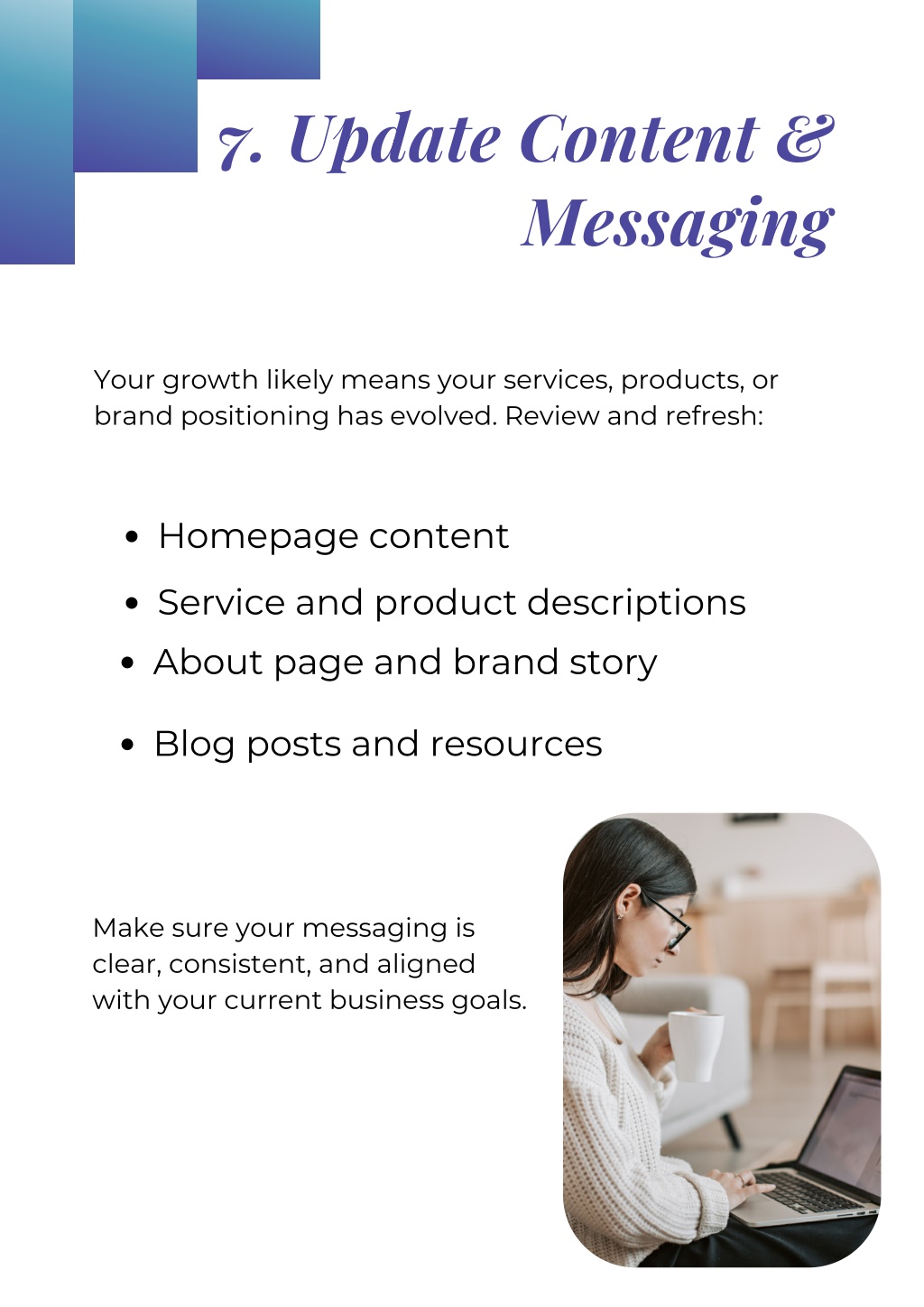 7. Update Content & Messaging Your growth likely means your services, products, or brand positioning has evolved. Review and refresh: Homepage content Service and product descriptions About page and brand story Blog posts and resources Make sure your messaging is clear, consistent, and aligned with your current business goals.