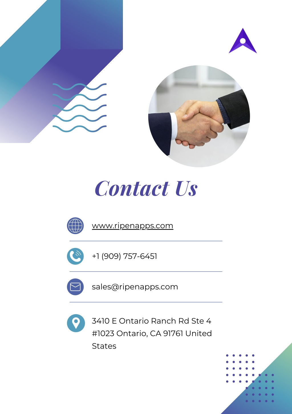 Contact Us www.ripenapps.com +1 (909) 757-6451 sales@ripenapps.com 3410 E Ontario Ranch Rd Ste 4 #1023 Ontario, CA 91761 United States
