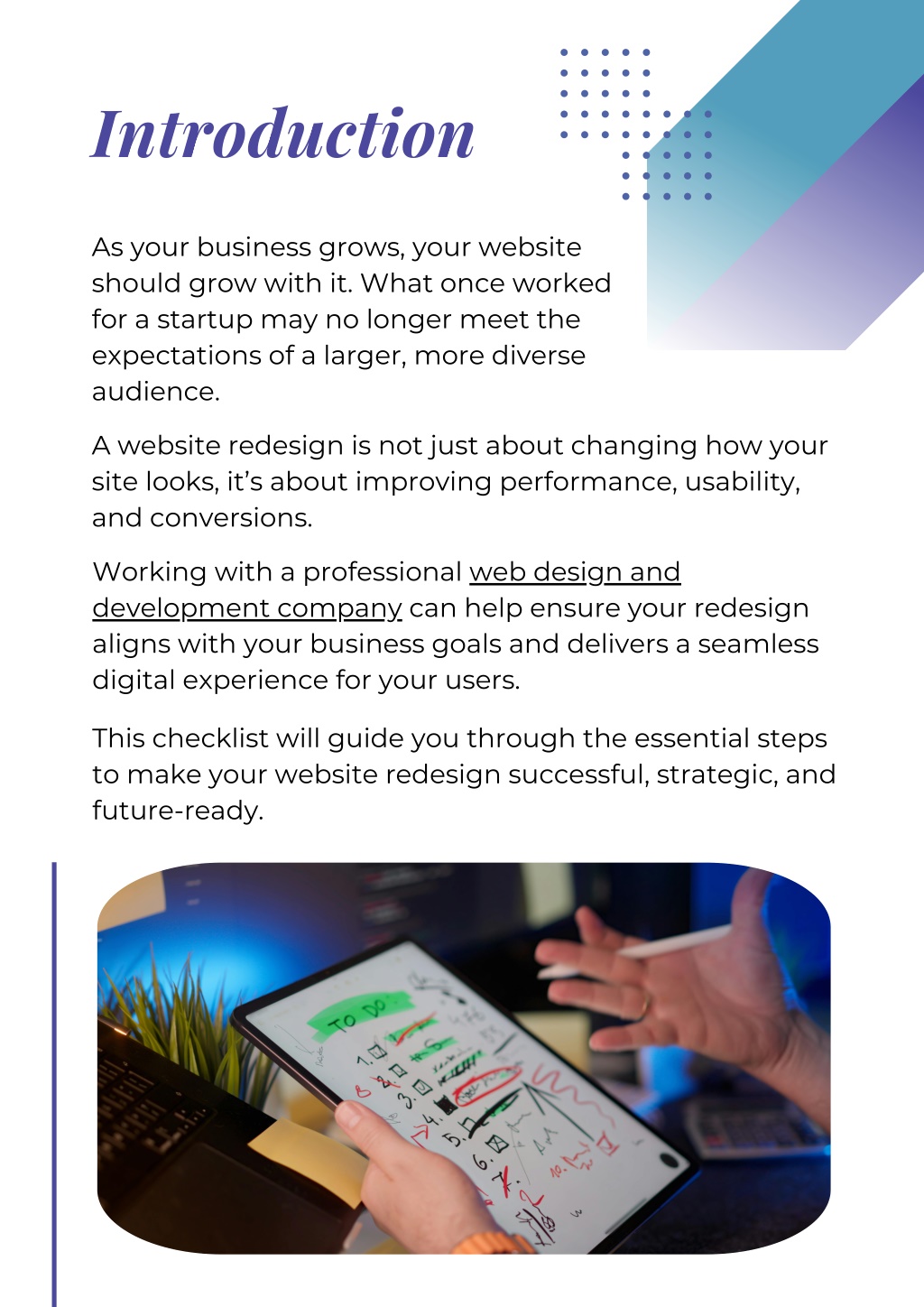 Introduction As your business grows, your website should grow with it. What once worked for a startup may no longer meet the expectations of a larger, more diverse audience. A website redesign is not just about changing how your site looks, it’s about improving performance, usability, and conversions. Working with a professional web design and development company can help ensure your redesign aligns with your business goals and delivers a seamless digital experience for your users. This checklist will guide you through the essential steps to make your website redesign successful, strategic, and future-ready.