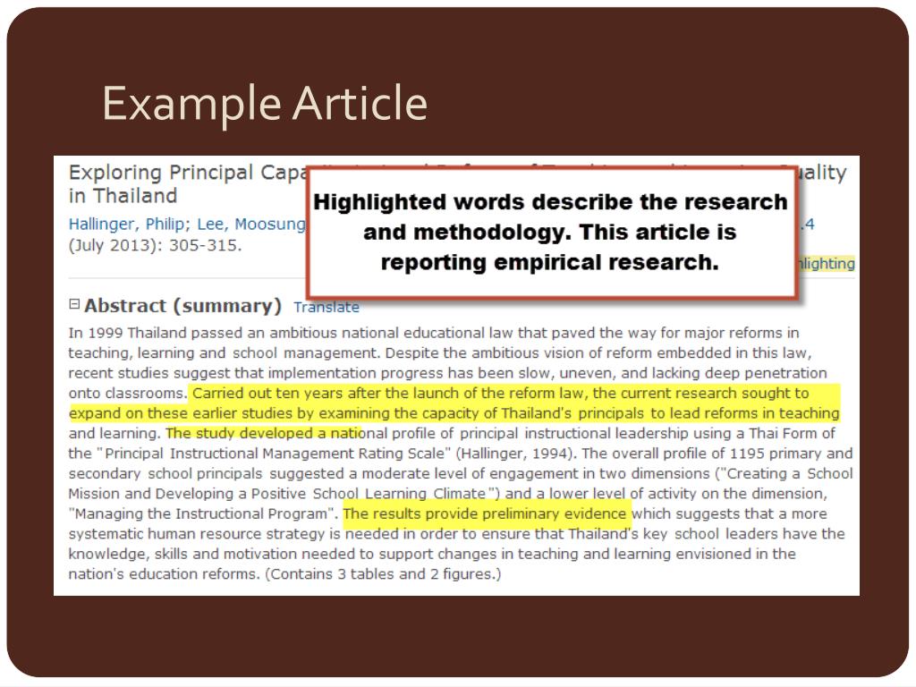 Table of Contents* • What are empirical research articles? • Why do I need to find empirical research articles? • What is ERIC? • How do I access ERIC? • Finding empirical research articles in ERIC • Tell ERIC to find empirical research articles • Bonus: How to read an empirical research article *Skip to the section you need by clicking the link for it.