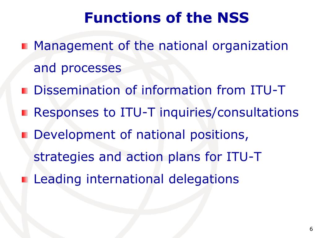 Functions of the NSS Management of the national organization and processes Dissemination of information from ITU-T Responses to ITU-T inquiries/consultations Development of national positions, strategies and action plans for ITU-T Leading international delegations