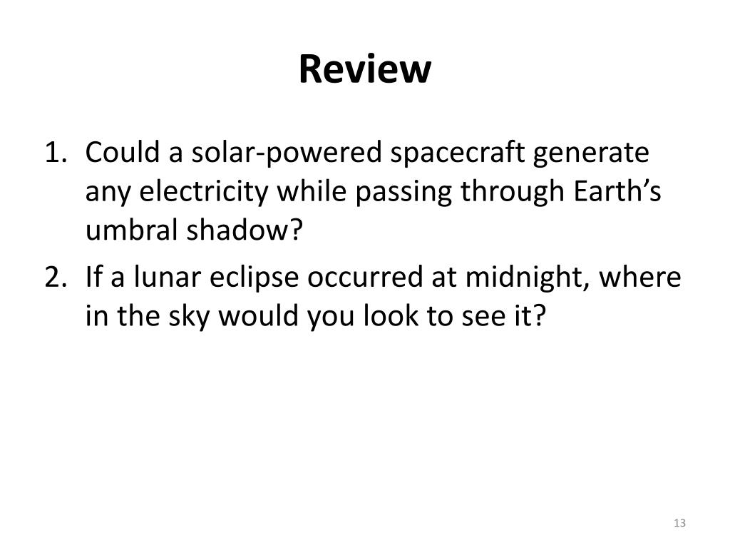 Review • Could a solar-powered spacecraft generate any electricity while passing through Earth’s umbral shadow? • If a lunar eclipse occurred at midnight, where in the sky would you look to see it?