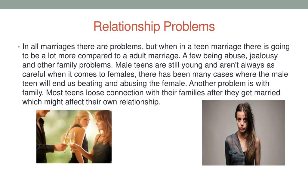Relationship Problems • In all marriages there are problems, but when in a teen marriage there is going to be a lot more compared to a adult marriage. A few being abuse, jealousy and other family problems. Male teens are still young and aren't always as careful when it comes to females, there has been many cases where the male teen will end us beating and abusing the female. Another problem is with family. Most teens loose connection with their families after they get married which might affect their own relationship.