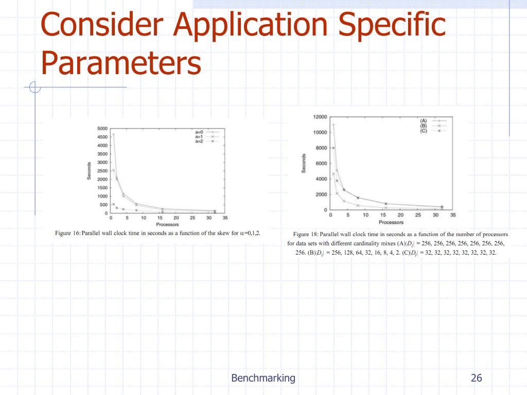 Example of Benchmarking • See http://web.cs.dal.ca/~arc/publications/1-20/paper.pdf We have implemented our optimized data partitioning method for shared-nothing data cube generation using C++ and the MPI communication library. This implementation evolved from (Chen, et.al. 2004), the code base for a fast sequential Pipesort (Dehne, et.al. 2002) and the sequential partial cube method described in (Dehne, et.al. 2003). Most of the required sequential graph algorithms, as well as data structures like hash tables and graph representations, were drawn from the LEDA library (LEDA, 2001). Benchmarking