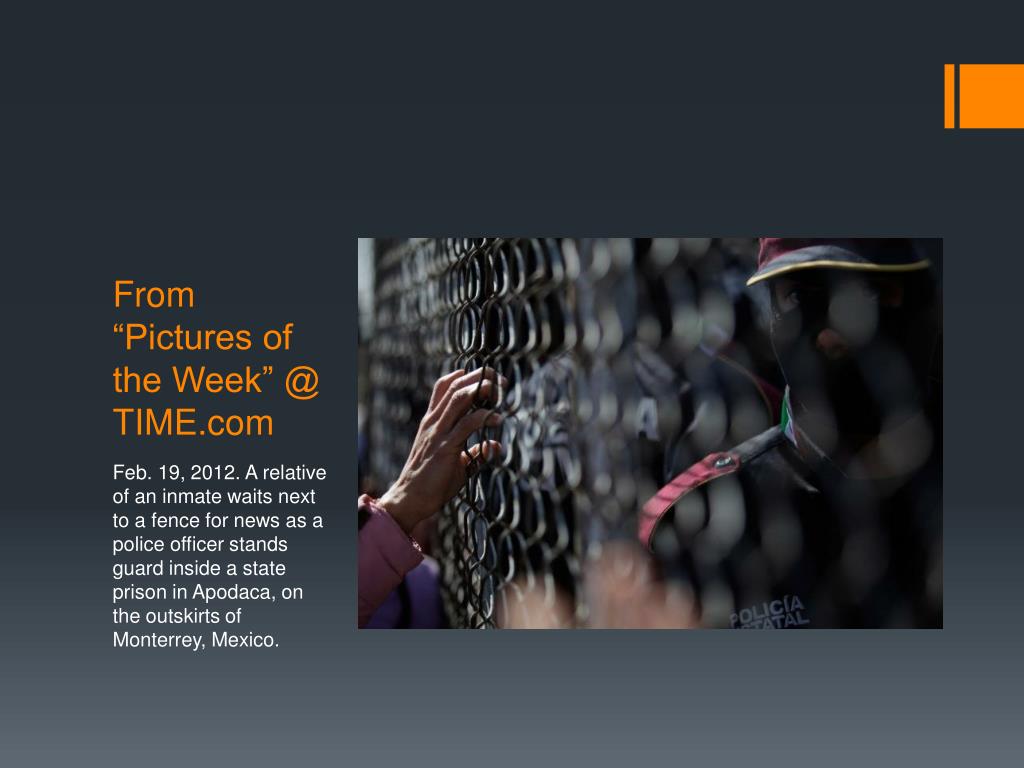 From “Pictures of the Week” @ TIME.com Feb. 19, 2012. A relative of an inmate waits next to a fence for news as a police officer stands guard inside a state prison in Apodaca, on the outskirts of Monterrey, Mexico.
