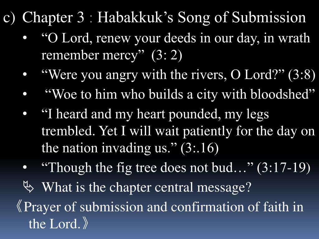 Chapter 3:Habakkuk’s Song of Submission • “O Lord, renew your deeds in our day, in wrath remember mercy” (3: 2) • “Were you angry with the rivers, O Lord?” (3:8) • “Woe to him who builds a city with bloodshed” • “I heard and my heart pounded, my legs trembled. Yet I will wait patiently for the day on the nation invading us.” (3:.16) • “Though the fig tree does not bud…” (3:17-19) • What is the chapter central message? • 《Prayer of submission and confirmation of faith in the Lord.》
