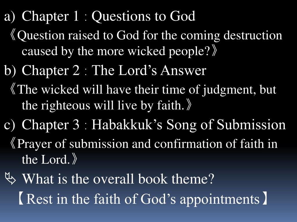 Chapter 1:Questions to God • 《Question raised to God for the coming destruction caused by the more wicked people?》 • Chapter 2:The Lord’s Answer • 《The wicked will have their time of judgment, but the righteous will live by faith.》 • Chapter 3:Habakkuk’s Song of Submission • 《Prayer of submission and confirmation of faith in the Lord.》 • What is the overall book theme? • 【Rest in the faith of God’s appointments】
