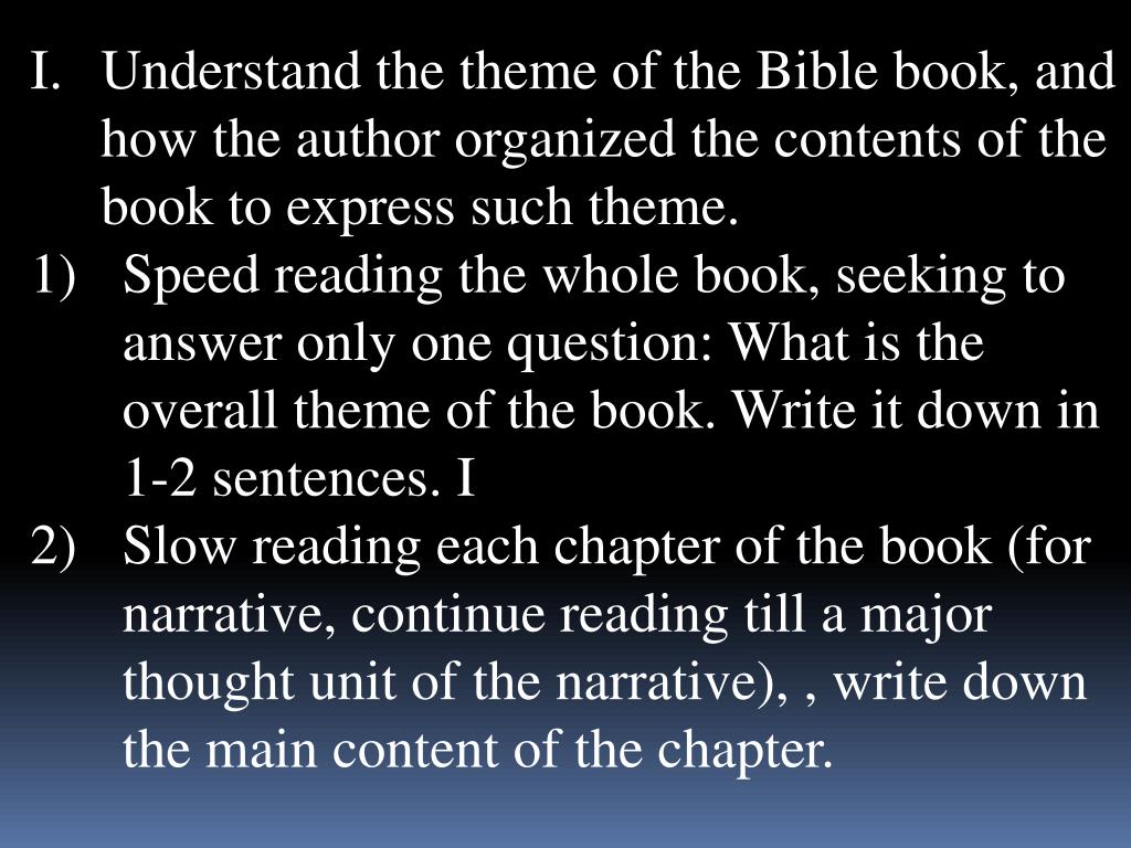 Expository Bible Study(I) Finding Bible book themes. Main components of an expository Bible study: Understand the theme of the Book. Understand how the author structure the contents of the book to express the theme and the message.