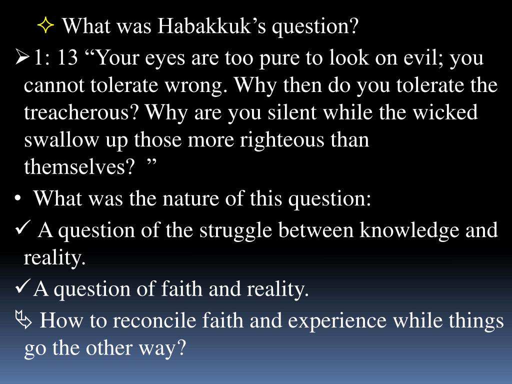 What was Habakkuk’s question? • 1: 13 “Your eyes are too pure to look on evil; you cannot tolerate wrong. Why then do you tolerate the treacherous? Why are you silent while the wicked swallow up those more righteous than themselves? ” • What was the nature of this question: • A question of the struggle between knowledge and reality. • A question of faith and reality. • How to reconcile faith and experience while things go the other way?