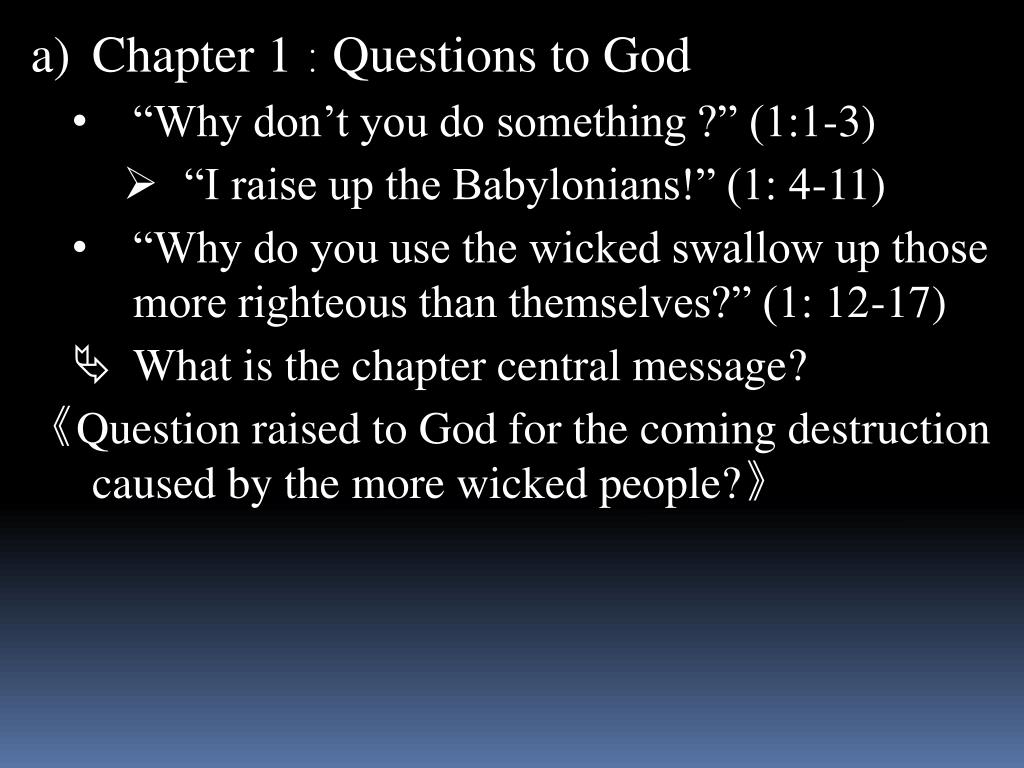 Chapter 1:Questions to God • “Why don’t you do something ?” (1:1-3) • “I raise up the Babylonians!” (1: 4-11) • “Why do you use the wicked swallow up those more righteous than themselves?” (1: 12-17) • What is the chapter central message? • 《Question raised to God for the coming destruction caused by the more wicked people?》