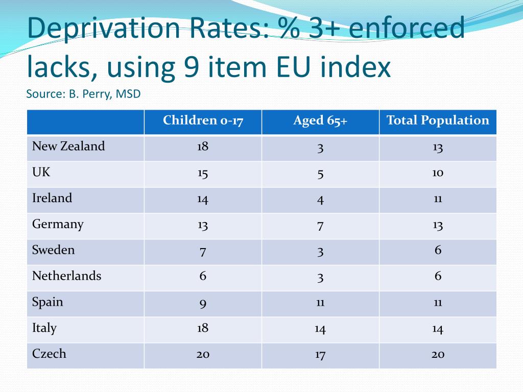 Deprivation Rates: % 3+ enforced lacks, using 9 item EU index Source: B. Perry, MSD
