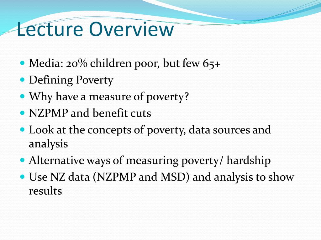 Lecture Overview • Media: 20% children poor, but few 65+ • Defining Poverty • Why have a measure of poverty? • NZPMP and benefit cuts • Look at the concepts of poverty, data sources and analysis • Alternative ways of measuring poverty/ hardship • Use NZ data (NZPMP and MSD) and analysis to show results