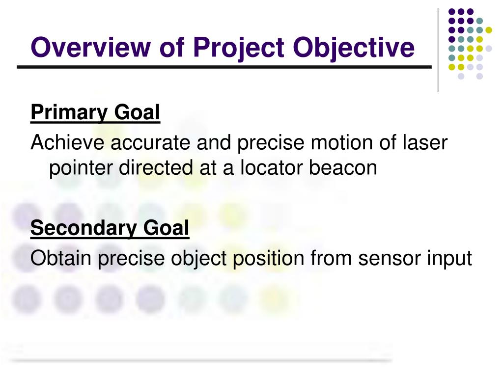 Overview of Project Objective Primary Goal Achieve accurate and precise motion of laser pointer directed at a locator beacon Secondary Goal Obtain precise object position from sensor input