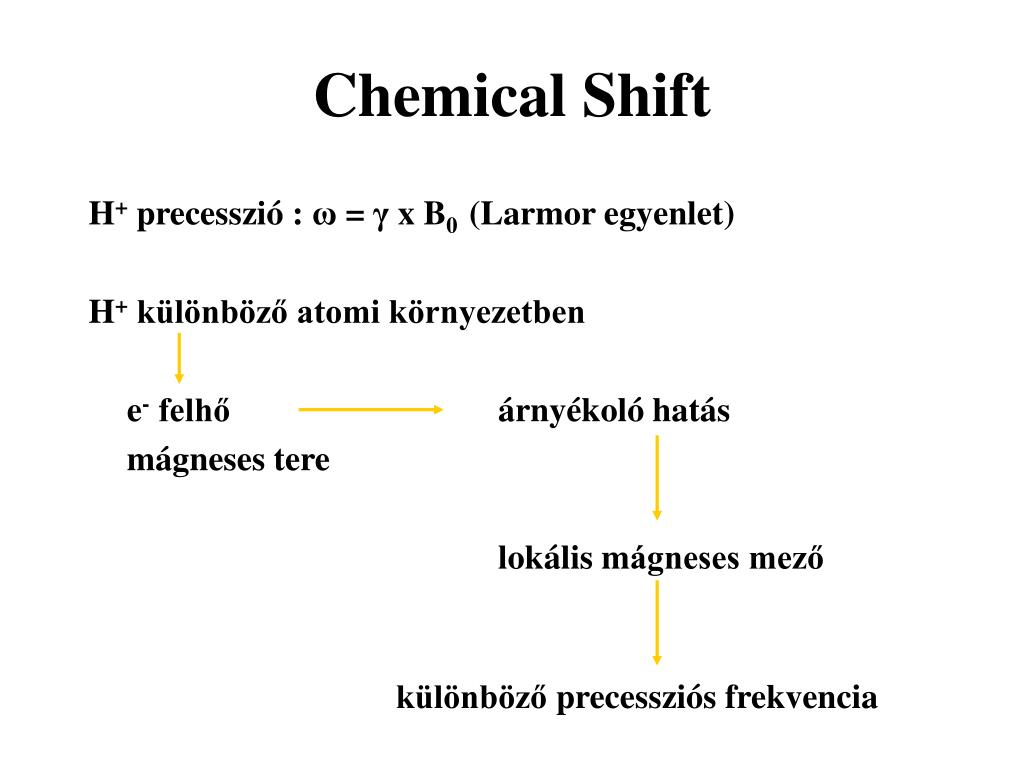 Chemical Shift H+ precesszió : ω = γ x B0(Larmor egyenlet) H+különböző atomi környezetben e-felhő árnyékoló hatás mágneses tere lokális mágneses mező különböző precessziós frekvencia