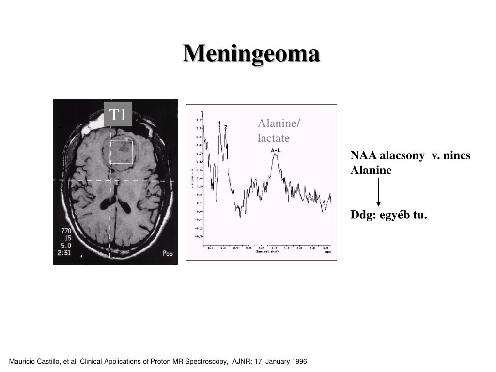 T1 Alanine/ lactate NAA alacsony v. nincs Alanine Ddg: egyéb tu. Meningeoma Mauricio Castillo, et al, Clinical Applications of Proton MR Spectroscopy, AJNR: 17, January 1996