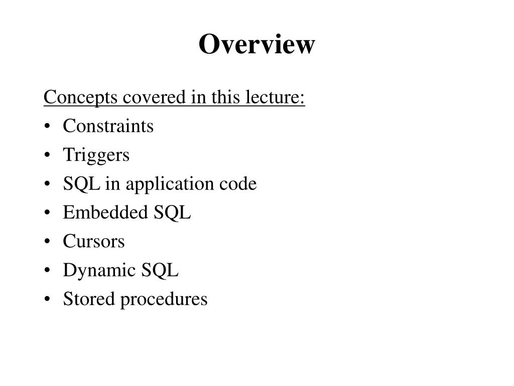 Overview Concepts covered in this lecture: • Constraints • Triggers • SQL in application code • Embedded SQL • Cursors • Dynamic SQL • Stored procedures