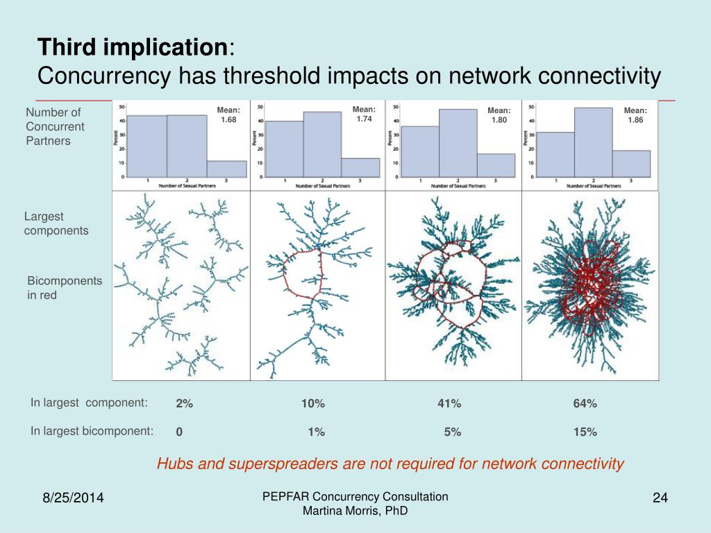 Mean: 1.74 Number of Concurrent Partners Mean: 1.68 Mean: 1.80 Mean: 1.86 Largest components In largest component: In largest bicomponent: 2% 0 10% 1% 41% 5% 64% 15% Third implication: Concurrency has threshold impacts on network connectivity Bicomponents in red Hubs and superspreaders are not required for network connectivity PEPFAR Concurrency Consultation Martina Morris, PhD