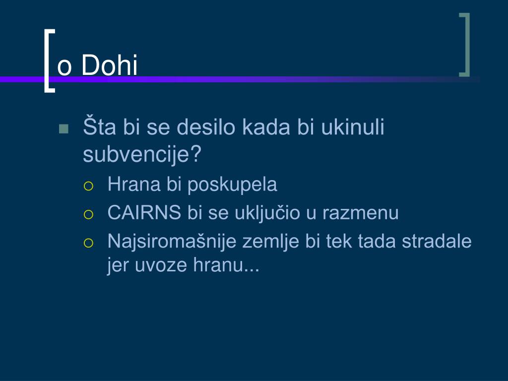 o Dohi • Šta bi se desilo kada bi ukinuli subvencije? • Hrana bi poskupela • CAIRNS bi se uključio u razmenu • Najsiromašnije zemlje bi tek tada stradale jer uvoze hranu...