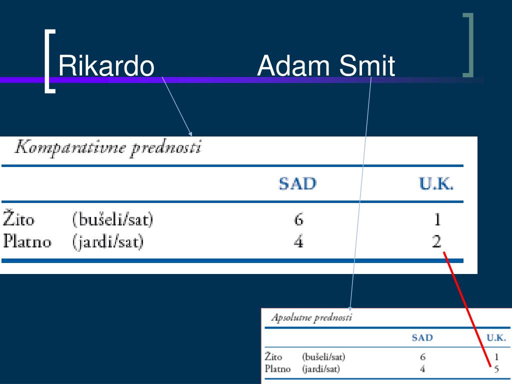 Adam Smit • da bi dve države međusobno dobrovoljnotrgovale, obe moraju da budu na dobitku od razmene. • Ukoliko jedna država ništa nedobija ili gubi, ona će jednostavno odbiti da trguje.