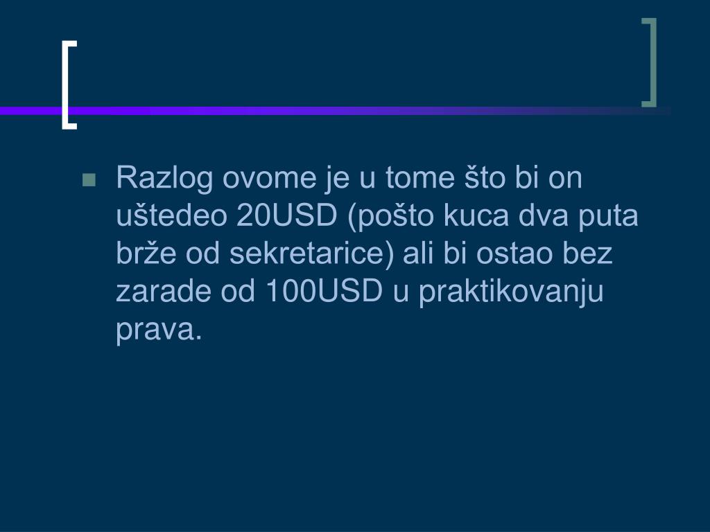 Razlog ovome je u tome štobi on uštedeo 20USD (pošto kuca dva puta brže od sekretarice) ali bi ostao bez zaradeod 100USD u praktikovanju prava.