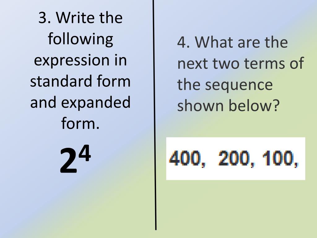 4. What are the next two terms of the sequence shown below? 3. Write the following expression in standard form and expanded form. 24 • The pattern in the sequence is the numbers are being divided by 2. To continue the pattern you divide the last term by 2. • 100 / 2 = 50 • 50 / 2 = 25 Expanded Form 2 * 2 * 2 * 2 Standard Form 16