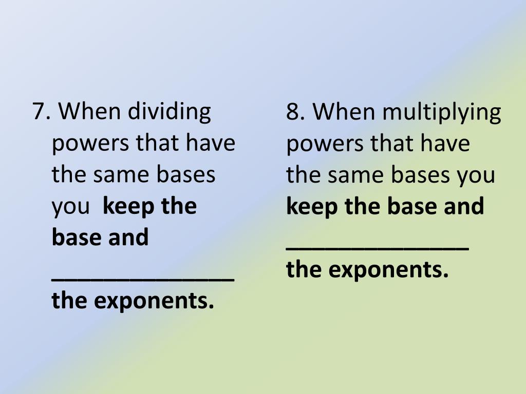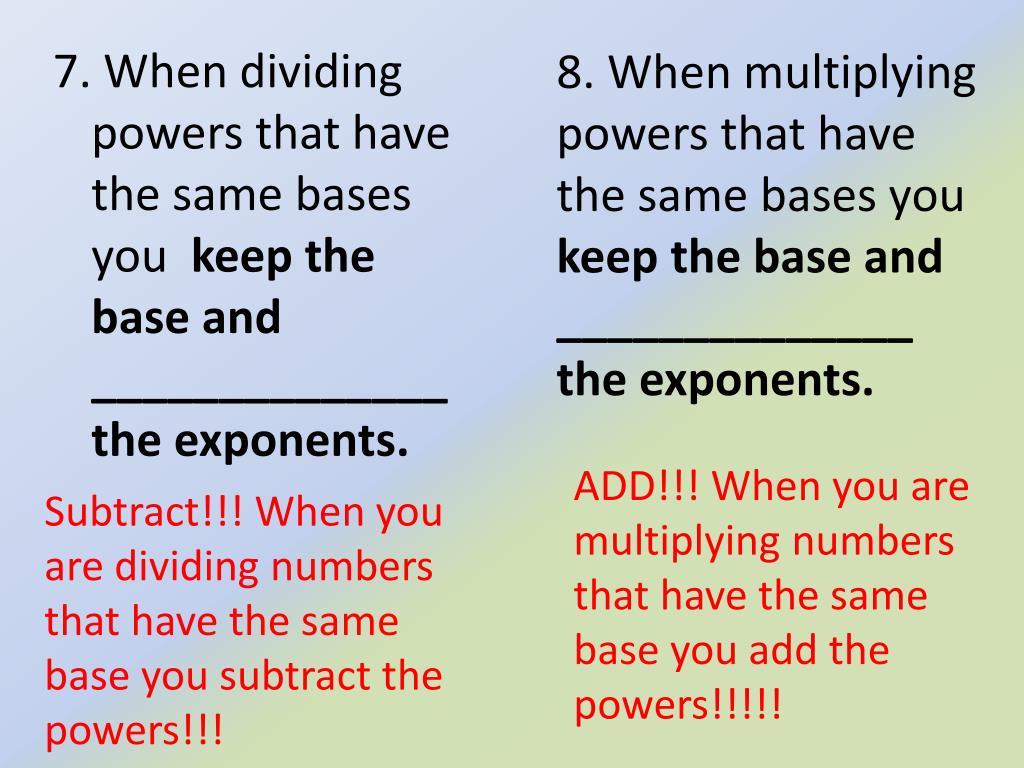 8. When multiplying powers that have the same bases you keep the base and ______________ the exponents. 7. When dividing powers that have the same bases you keep the base and ______________ the exponents.