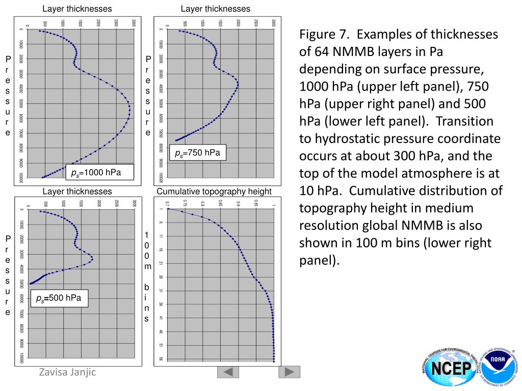 Layer thicknesses Layer thicknesses Figure 7. Examples of thicknesses of 64 NMMB layers in Pa depending on surface pressure, 1000 hPa (upper left panel), 750 hPa (upper right panel) and 500 hPa (lower left panel). Transition to hydrostatic pressure coordinate occurs at about 300 hPa, and the top of the model atmosphere is at 10 hPa. Cumulative distribution of topography height in medium resolution global NMMB is also shown in 100 m bins (lower right panel). Pressure Pressure ps=750 hPa ps=1000 hPa Layer thicknesses Cumulative topography height 100 m bins Pressure ps=500 hPa
