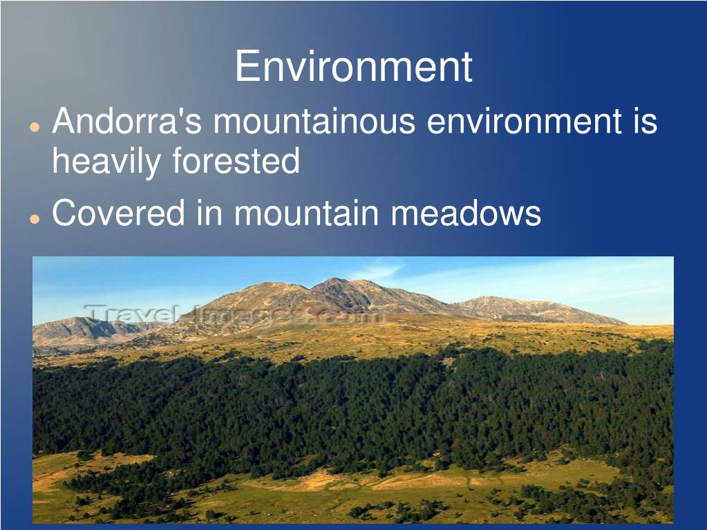 Environment Andorra's mountainous environment is heavily forested Covered in mountain meadows