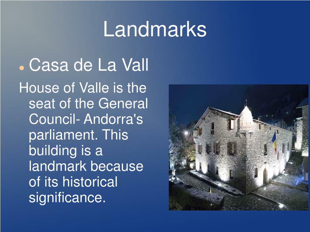 Landmarks Casa de La Vall House of Valle is the seat of the General Council- Andorra's parliament. This building is a landmark because of its historical significance.